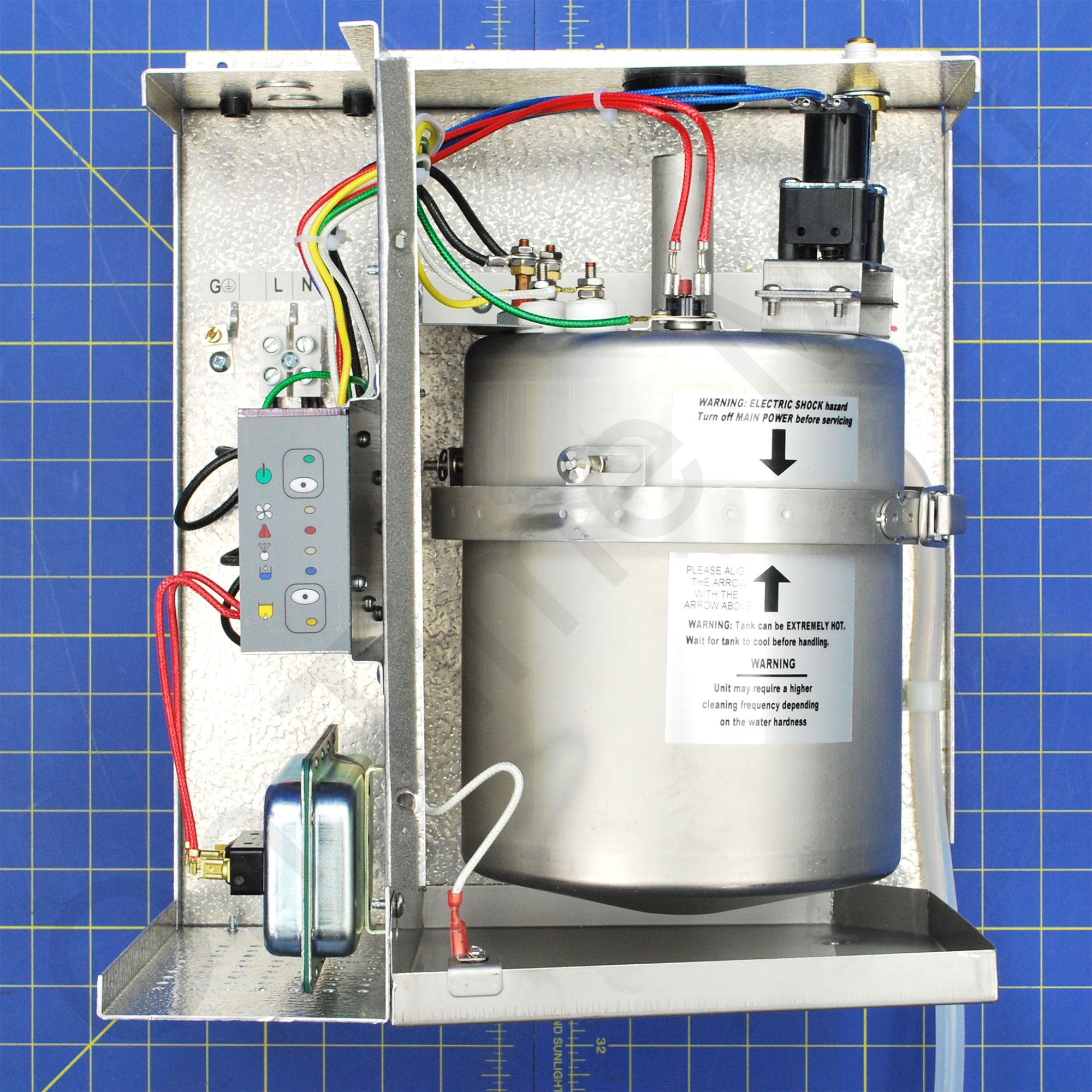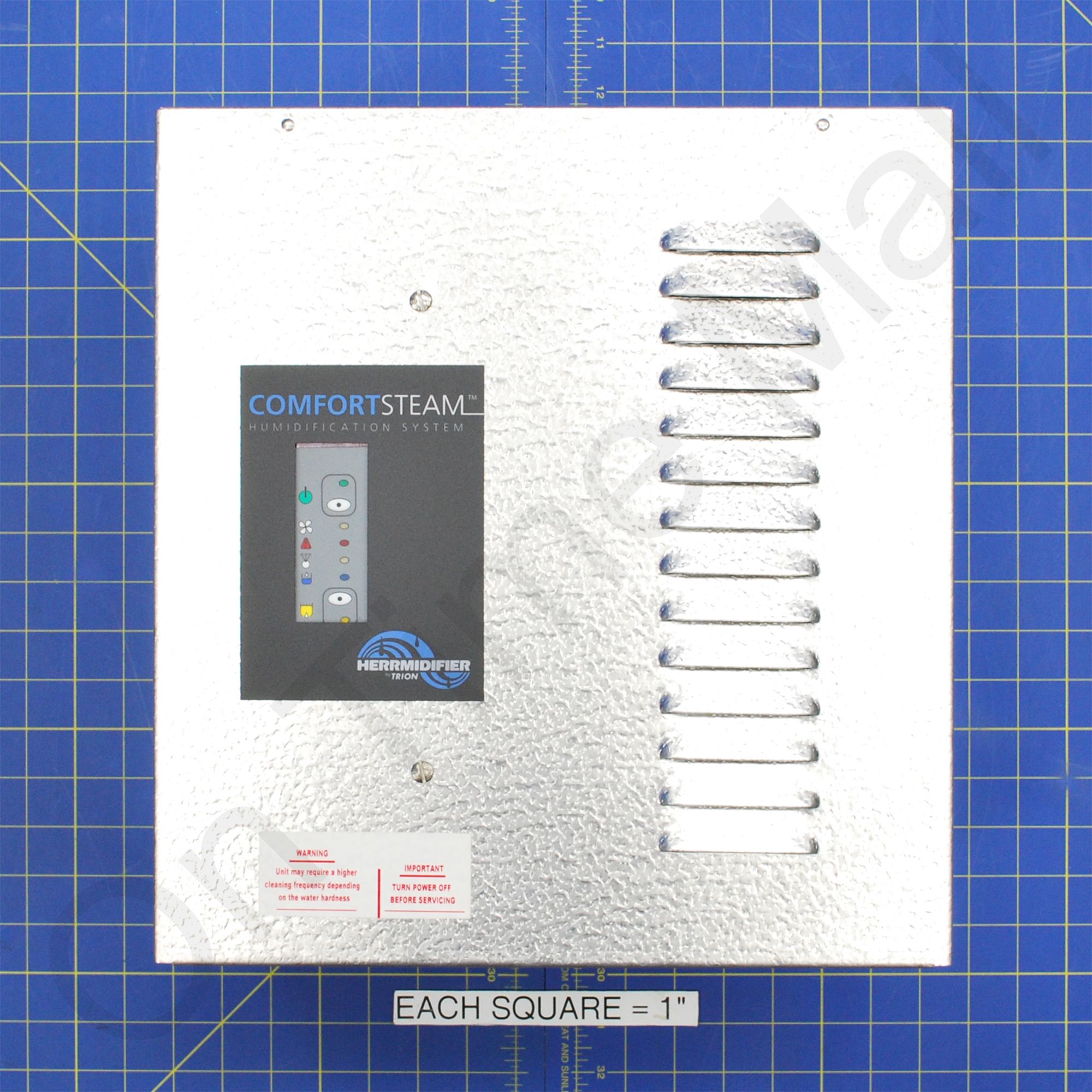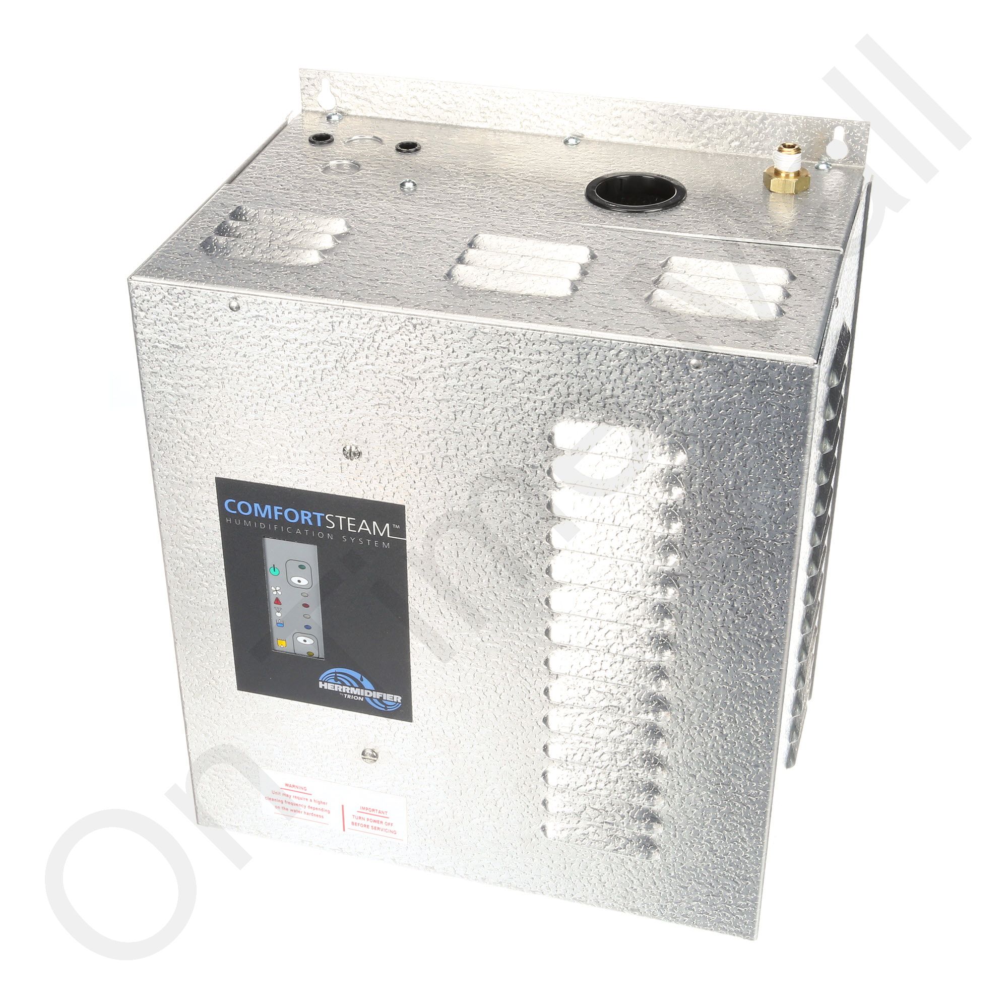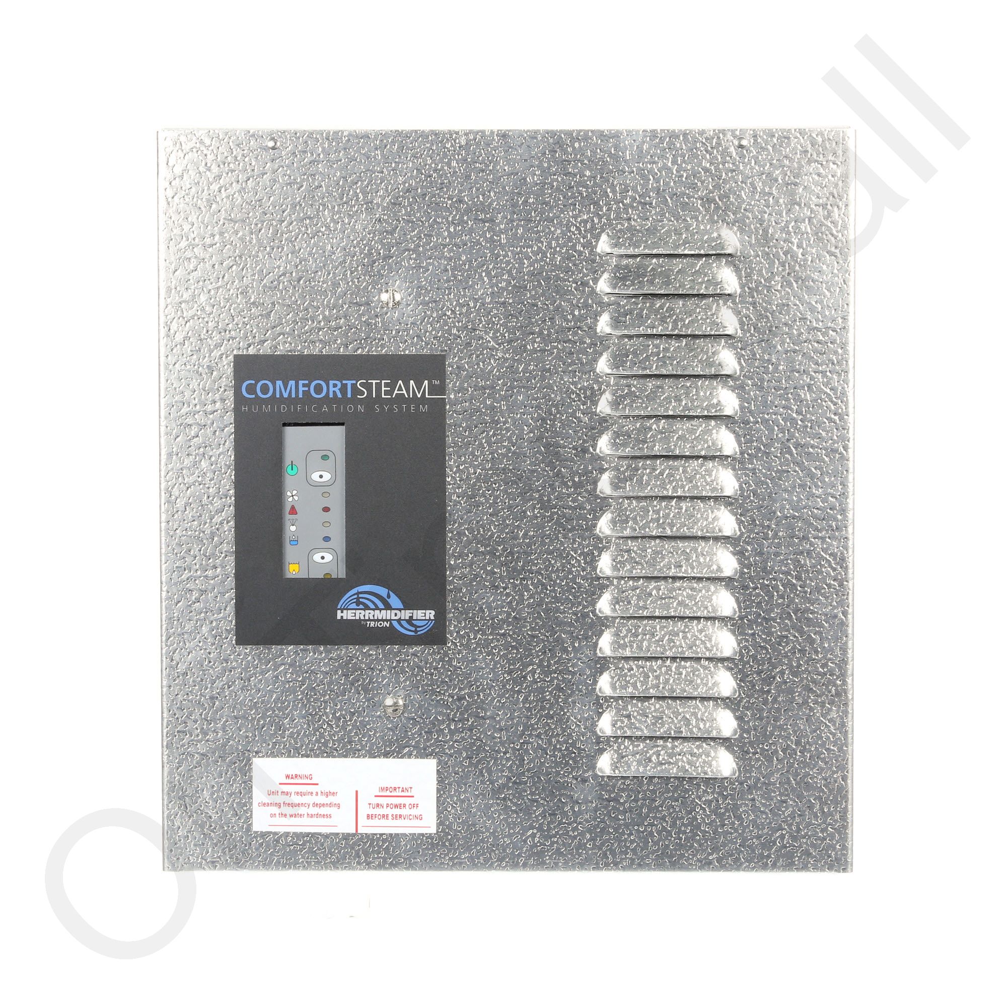 Trion 259940-002 ComfortSteam Unit W/O Humidistat. Also known as part 259940-002. This is a 13 GPD steam-style humidifier. Compact size and superior features make it simple to install, operate and maintain. Resistive heating elements are enclosed in a quick-release stainless steel tank which simplifies cleaning and does not require costly annual replacements. Mixes cold water with hot water for the drain cycle to reduce drain water temperature. Has a built-in overflow protection sensor with an automatic shutdown safety system. Automatically flushes water to self-clean. Self-drains at end of the season. Made of metal not cheap plastic like the Honeywell True Steam. Has built-in fault annunciation LED, on-board diagnostics, and operational display. This does include the built in airflow sensor and water hammer absorber but does NOT include a humidistat.